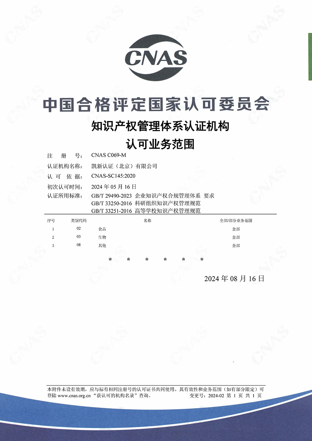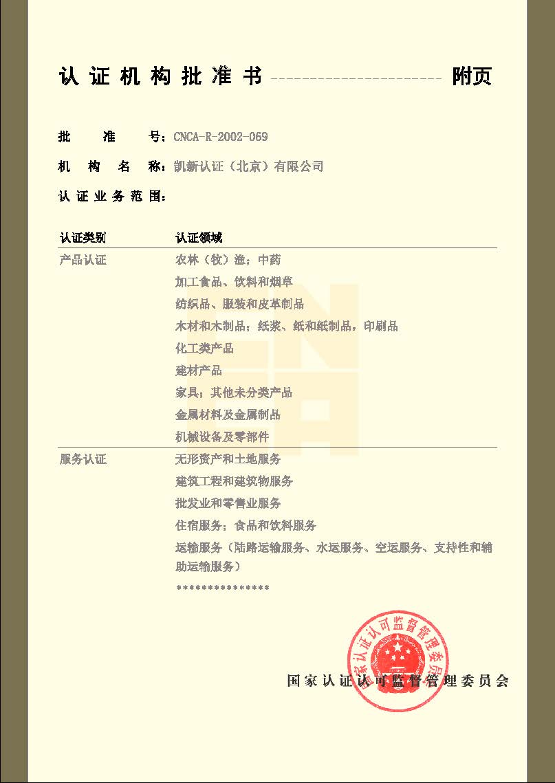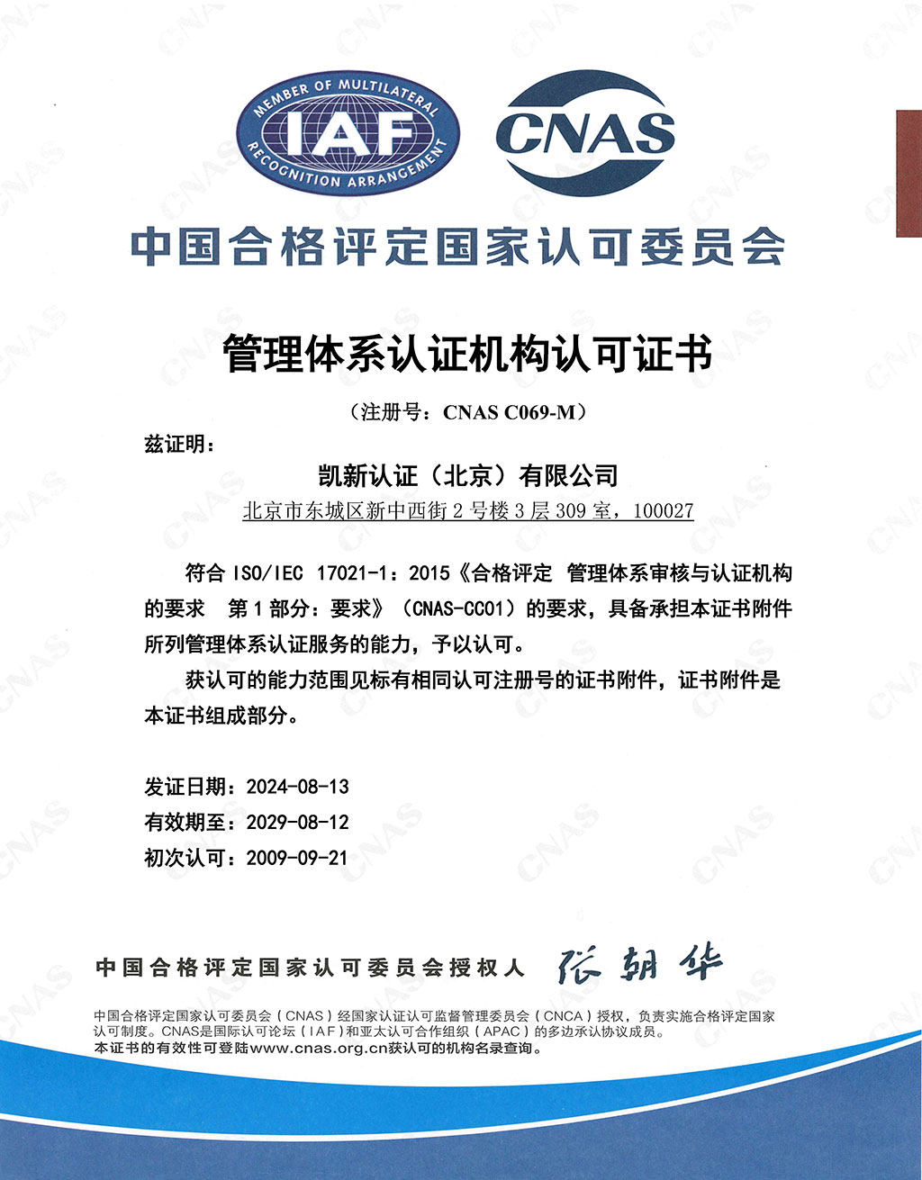 CNAS管理體系認證機構認可證書