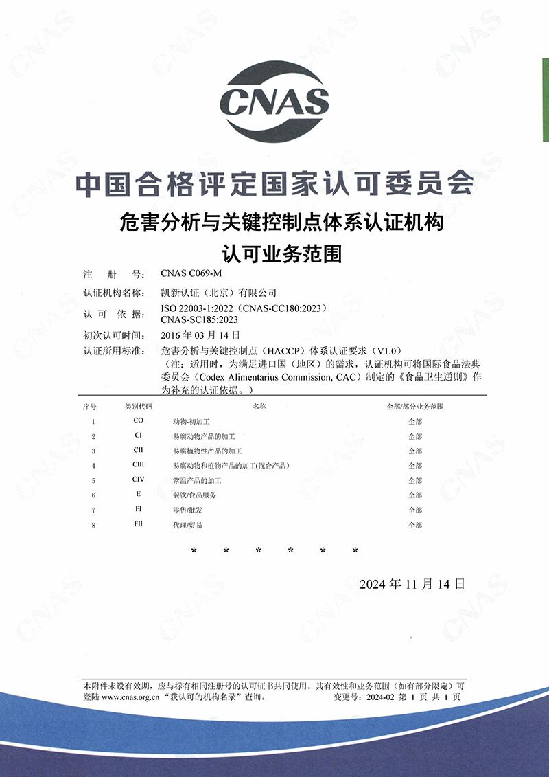 CNAS認可HACCP范圍