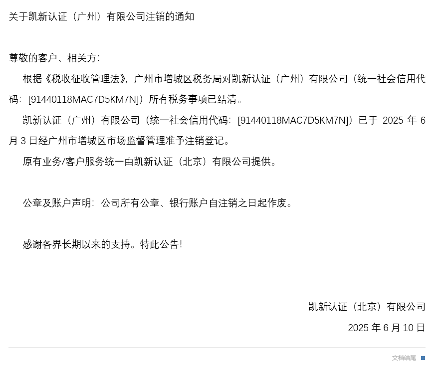 關于子公司凱新認證(廣州)有限公司注銷的通知
