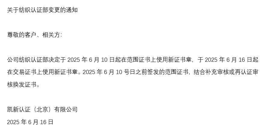 尊敬的客戶、相關方: 凱新認證(北京)有限公司已于2025年4月22日完成公司股權變更、法定代表人變更、營業執照變更等手續,成為中瑞集團的全資子公司,由集團北亞區副總裁李文江先生擔任凱新的法定代表人及總經理。272025-04